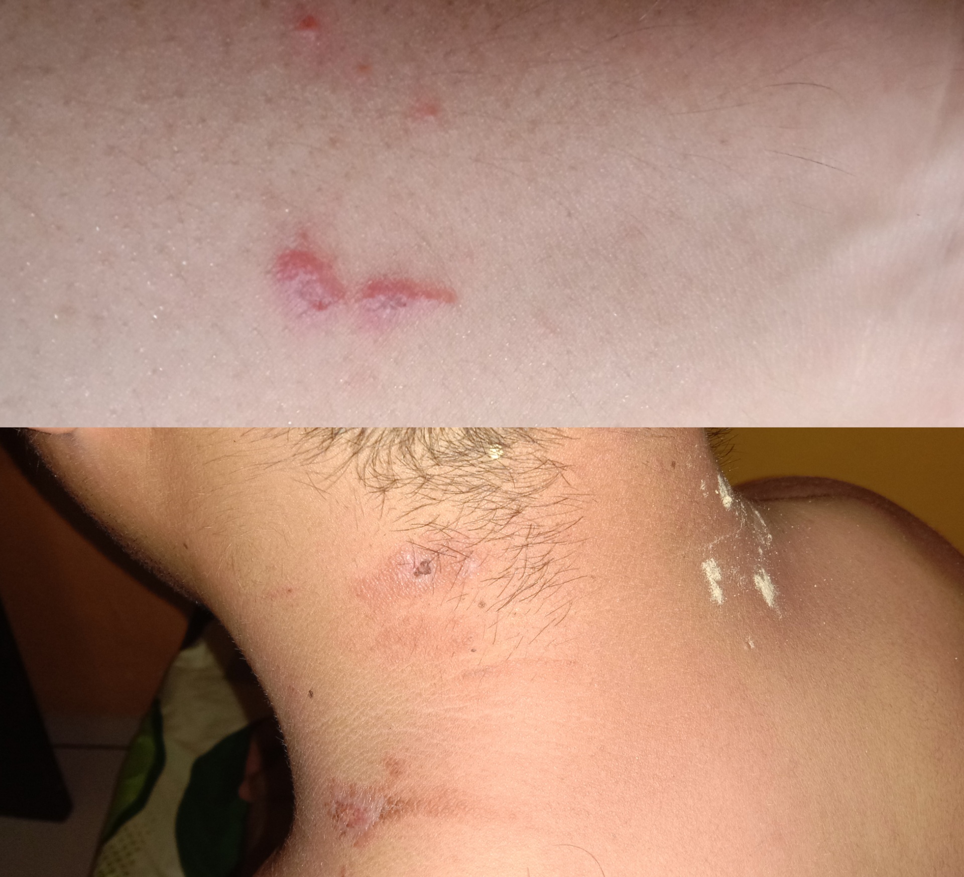 Luka melepuh bagian tangan dan leher akibat terkena racun tomcat