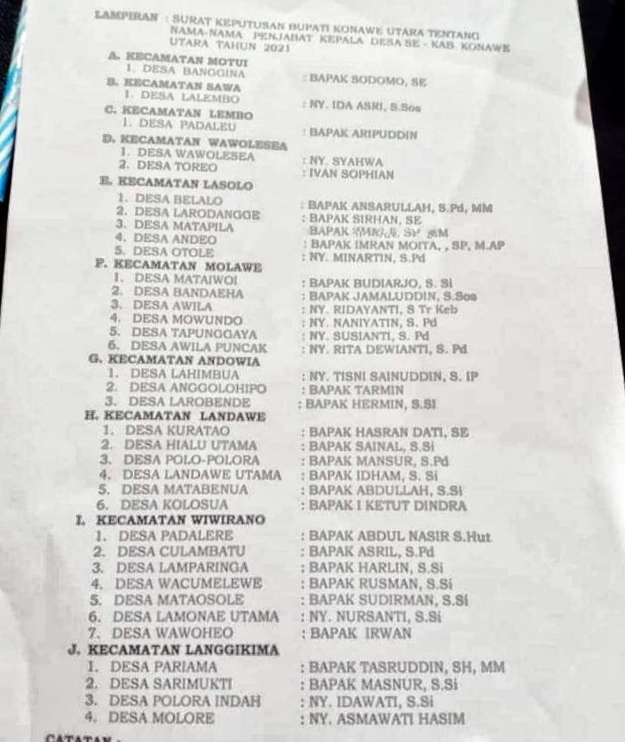 Pelantikan Pj Kepala Desa sesuai ketentuan Surat Keputusan (SK) Bupati Konut Nomor 203/240 Tahun 2021 tentang pemberhentian Pejabat Kepala Desa dan Pengangkatan Pejabat Kepala Desa dalam Wilayah Konut.
