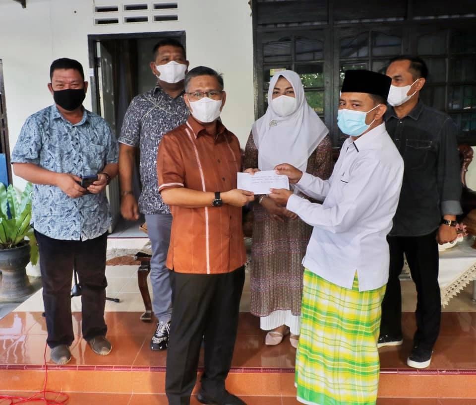 Ketgam: Wali Kota Kendari, Sulkarnain Kadir saat menyerahkan bantuan mesjid Jami Al-Ikhlas yang berada di Kelurahan Kambu.(Foto:Indosultra.Com).