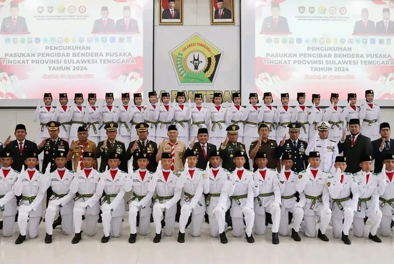 Indosultra.com, Kendari – Sebanyak 43 orang putra dan putri terbaik dari kabupaten/kota, Sulawesi Tenggara (Sultra) yang akan menjadi anggota Pasukan Pengibar Bendera (Paskibra), di Hari Ulang Tahun (HUT) RI ke – 79 pada Sabtu 17 Agustus 2024, resmi dikukuhkan Pejabat (Pj) Gubernur Sultra, Andap Budhi Revianto di Aula Bahteramas Kantor Gubernur Sultra, Kamis (15/8/2024).