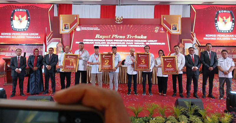 Dimana, Komisi Pemilihan Umum (KPU) Sulawesi Tenggara (Sultra) menetapkan nomor urut pasangan calon yakni, Ruksamin-Syafei Kahar nomor urut 1, Andi Sumangerukka-Hugua 2, Lukman Abunawas-La Ode Ida 3 dan Tina Nur Alam-LM Ihsan Taufik Ridwan 4.