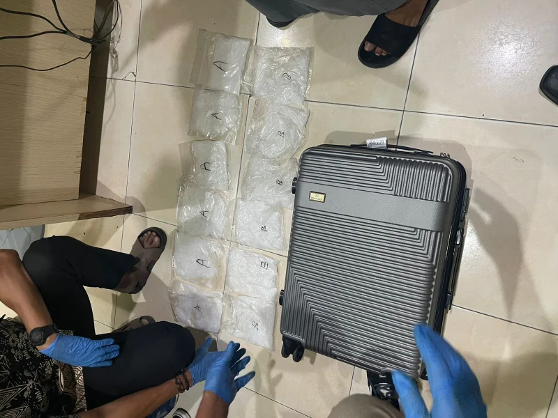 ”Dari hasil pemeriksaan, petugas menemukan narkotika jenis sabu seberat 2.030,8 gram (2 kilogram lebih) yang disembunyikan di dalam koper milik pelaku,” katanya.