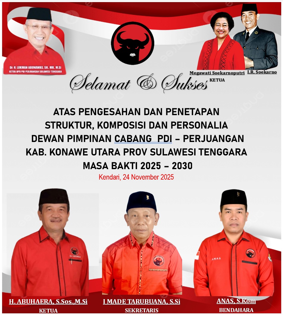 Acara pengesahan dan penetapan struktur, komposisi dan personalia pengurus PDI-P Konut ini dihadiri oleh jajaran pengurus partai, tokoh masyarakat, dan perwakilan pemerintah daerah. Untuk Ketua, Abu Haera, S.Sos.,M.Si, Sekertaris, I Made Tarabuan, S.Si, Bendahara, Anas, S.Com.