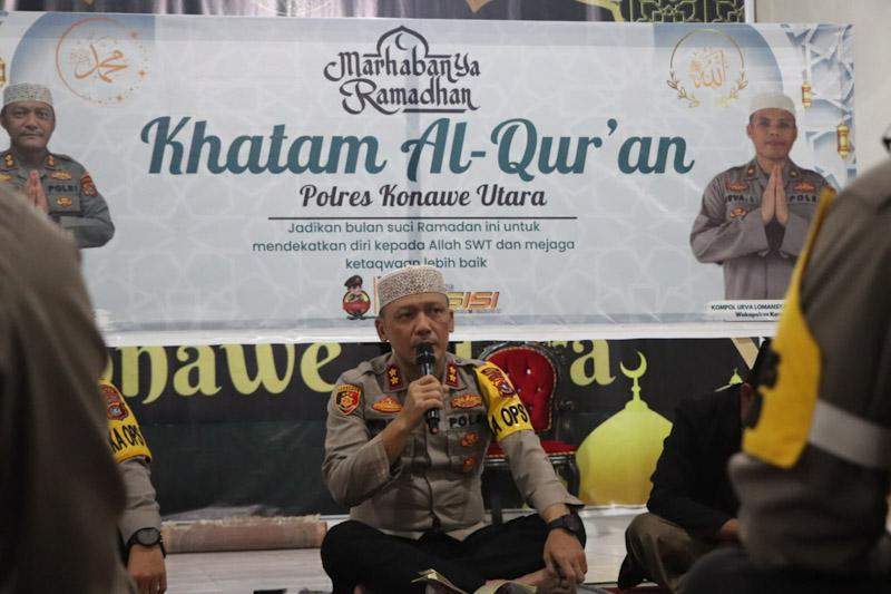 Kapolres Konawe utara AKBP Priyo utomo, S.H., S.I.K dalam sambutannya pada pembukaan acara khatam Al-qur’an mengatakan kegiatan positif seperti ini harus terus kita pelihara dan tingkatkan, sebagai rasa syukur kita dibulan suci ramadhan kepada Sang Pencipta Tuhan Yang Maha Esa