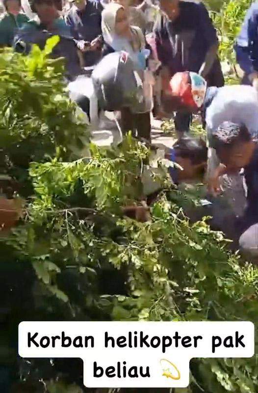 Namun, kencangnya angin yang ditimbulkan dari helikopter membuat dahan pohon yang berada di lokasi tumbang dan menimpa warga.