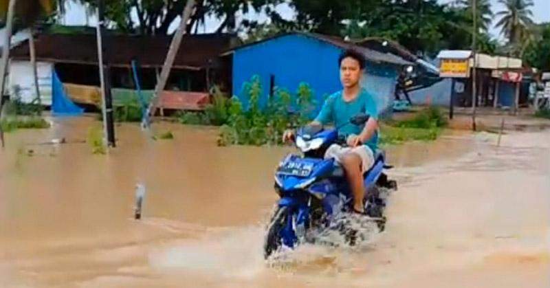 Dari pantauan awak media Kamis (29/2/2024), air setinggi betis orang dewasa menutupi badan jalan.