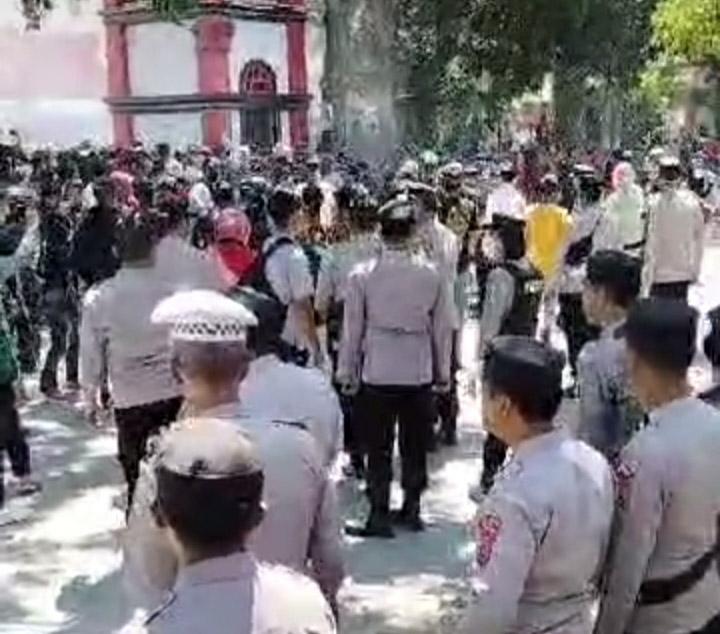 Dimana aksi tersebut ricuh, akibat massa aksi bertindak anarkistis dengan melempari aparat keamanan dengan batu.