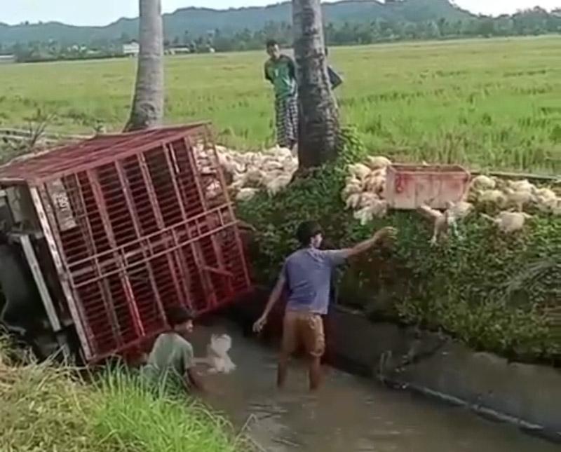 Nampak puluhan ayam potong yang berada di dalam kendaraan tampak diselamatkan oleh warga. Mereka berupaya mengangkat ayam-ayam tersebut agar tidak kedinginan dan tenggelam di air.