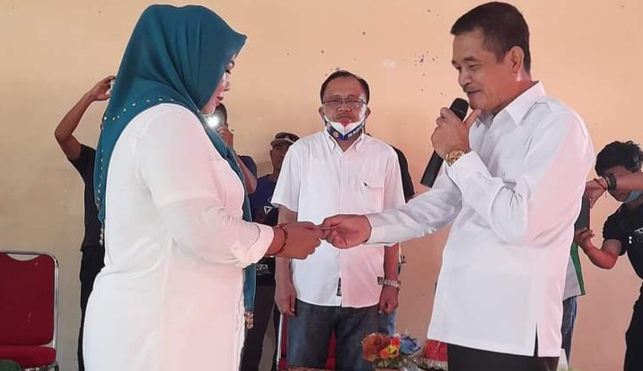 Ketgam: Ketua Tim Pemenangan paslon Rabu, Sudiro bersama paslon Bupati dan Wakil Bupati Konut, Ruksamin-Abu Haera saat mengukuhkan 358 orang perwakilan tim RA Kartini dari jumlah keseluruhan 3.400 orang bertempat di Auala Hotel Oheo.