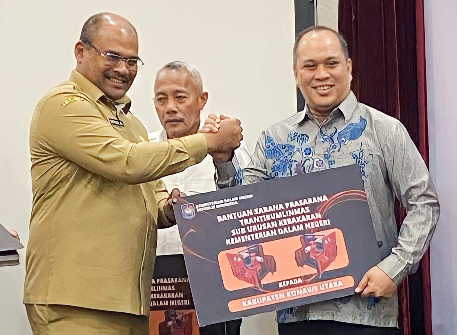 Bantuan diserahkan simbolis Ditjend Bina Adwil Kemendagri Republik Indonesia Dr Safrizal, kepada Bupati Konut Dr.Ir.H Ruksamin ST ,M.Si, IPU, Asean Eng. Turut mendampingi Kadis Pemadam Kebakaran Konut, Djasmiddin, dan Kabag Prokopi Sutriawan.