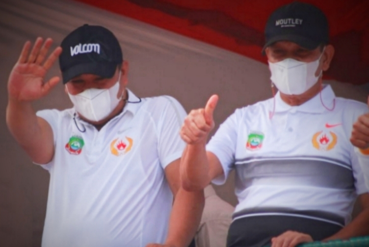 Ketgam: Bupati Konut, Ruksamin bersama Ketua KONI Konut, Abu Haera saat mengantar para atletnya berkompetisi di Kejuaraan POPDA ke ll se-Sultra.(Indosultra.Com).