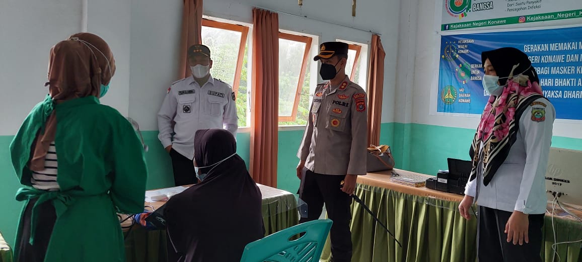 Ketgam: Bupati Konut bersama Kapolres Konut, Turun Minjau Pelaksanaan Vaksinasi Dipuskemas.(Indosultra.Com)