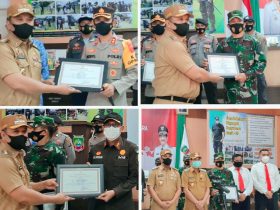 Ketgam: Satgas Covid-19 Konut bersama aparat gabungan Polres Konut, TNI Kodim 1417/Kendari, Kejari Konawe saat menerima piagam penghargaan atas dedikasi ...