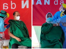 Ketgam: Bupati Konut, Ruksamin-Kadis Kesehatan Konut, Nurjannah Efendi saat menerima suntikan vaksin jenis sinovac oleh Tim Medis Covid Konut.(Indosultra.Com). Indosultra.Com, ...