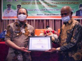 Ketgam: Bupati Konut, Ruksamin saat menerima penghargaan dari Kepala Kantor Regional IV BKN Makassar Harun Arsyad diacara bimtek E-kinerja di ...
