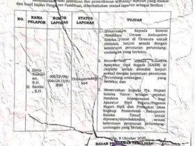 Ketgam: Surat pemberitahuan status laporan yang ditandatangani Ketua Bawaslu Koltim, Rusniyati Nur Rakibe yang ditemukan ditempat sampah. Indosultra.Com, Kolaka Timur- ...