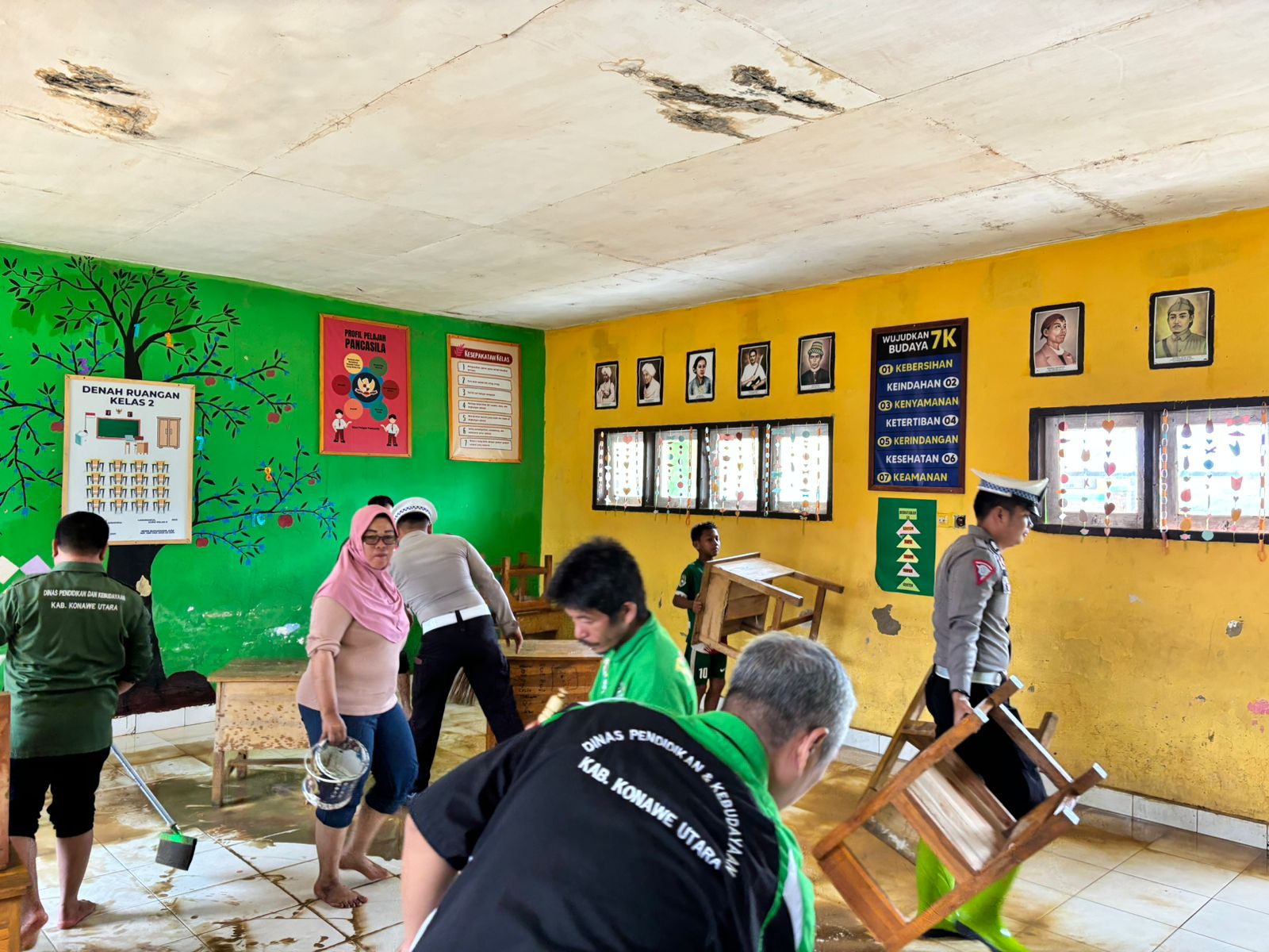 Lain dari itu, tim dari Satuan Lalulintas Polres Konut juga turun mengatur arus lalulintas di jalan poros umum yang juga sudah terendam banjir, dan membantu melakukan pembersihan di rumah-rumah sekolah yang terdampak banjir.