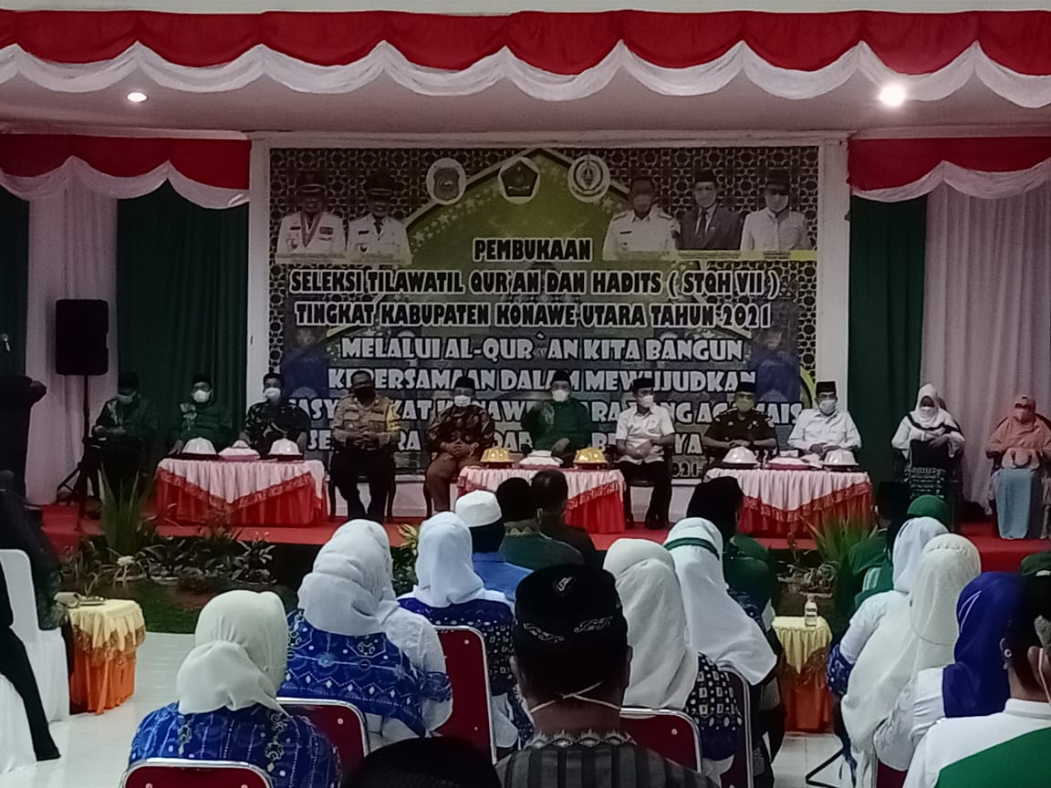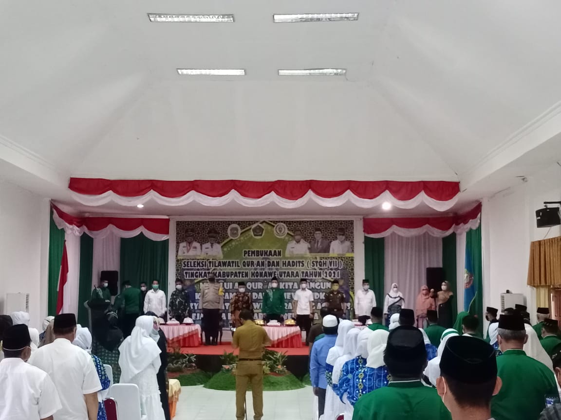 Indosultra.Com, Konawe Utara–Bupati Konawe Utara (Konut), Sulawesi Tenggara (Sultra), Ruksamin resmi membuka Seleksi Tilawah Quran dan Hadits (STQH) serta Lembaga Seni dan Qasidah Indonesia (LASQI) ke-7. Tempat acara di Aula Konasara, Selasa 23 Februari 2021.