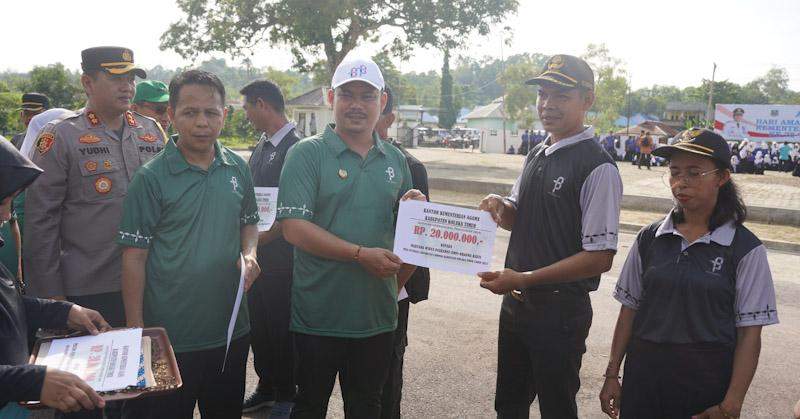 Setelah memimpin apel, Bupati Abd Azis juga menyerahkan bantuan operasional sekolah, bantuan operasional kepada kerukunan umat beragama, dan sumbangan dari Baznas kepada sejumlah penerima, menunjukkan semangat pengabdian dan pelayanan yang inklusif kepada masyarakat.