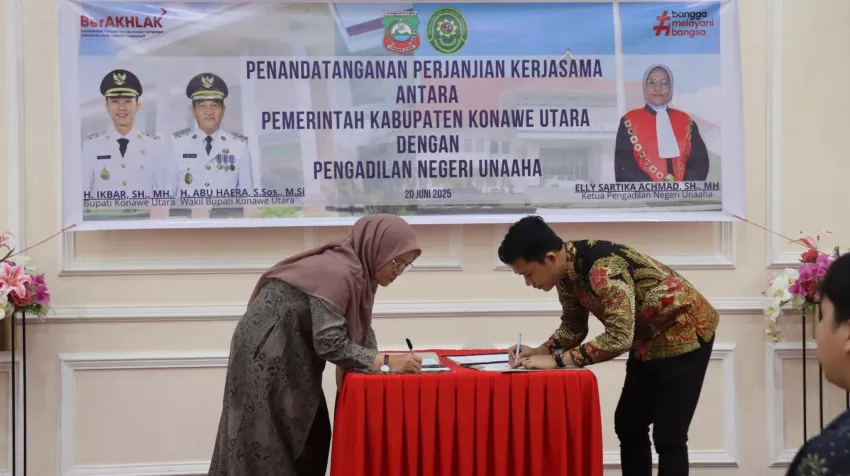 Indosultra.com, Kendari – Bupati Konawe Utara (Konut) , H. Ikbar, SH., MH., dan Ketua Pengadilan Negeri (PN) Unaaha, Elly Sartika Achmad, SH., resmi melakukan penandatanganan perjanjian kerjasama terkait layanan hukum bagi masyarakat, di salah satu Rumah Makan di Kota Kendari, Jumat (20/6/2025).