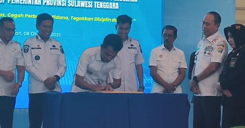 Indosultra.com, Kendari – Bupati Konawe Utara (Konut), H. Ikbar, menandatangani Komitmen Bersama Dukungan Informasi dan Pencegahan Aparatur Sipil Negara (ASN) terhadap tindak pidana di lingkup Pemerintah Provinsi Sulawesi Tenggara (Sultra). Kegiatan tersebut berlangsung di Hotel Azizah Kendari, Rabu (8/10/2025).