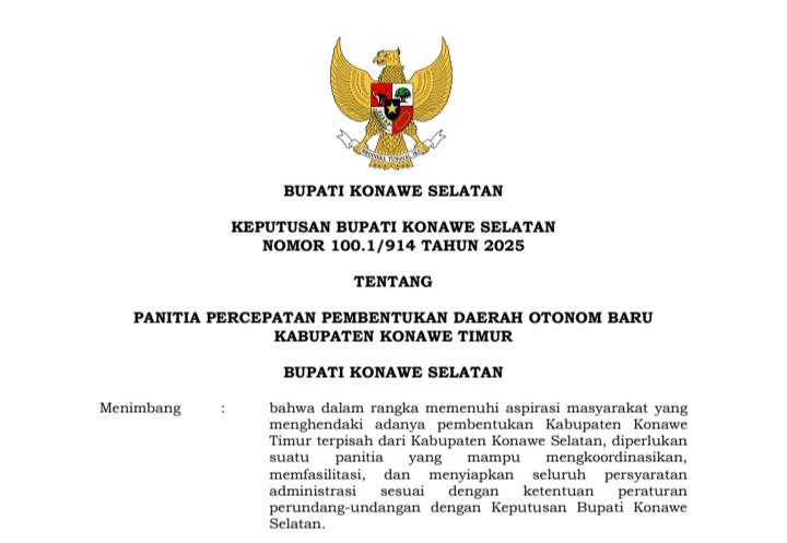 Keputusan ini disahkan melalui Keputusan Bupati Nomor 100.1/914 Tahun 2025 yang ditandatangani di Andoolo pada 12 November 2025. Pembentukan panitia ini menjadi langkah nyata Pemda Konsel dalam merespons aspirasi pemerataan pembangunan dan mendekatkan pelayanan publik.