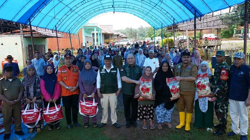 Didampingi jajarannya, Bupati Konut, Ruksamin kembali menyalurkan bantuan sembako kepada korban banjir di Desa Landiwo, Mata Benua, dan Kuratao, Kecamatan Langgikima.