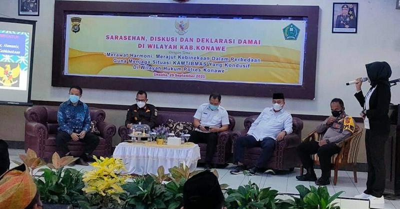 Indosultra.com, Unaaha – Kepolisian Resort (Polres) Konawe melaksanakan kegiatan sarasehan, diskusi dan deklarasi damai dengan mengangkat tema”Merawat Harmoni, Merajut Kebhinekaan dalam Perbedaan Guna Menjaga Situasi Kamtibmas yang kondusif di wilayah hukum Polres Konawe.