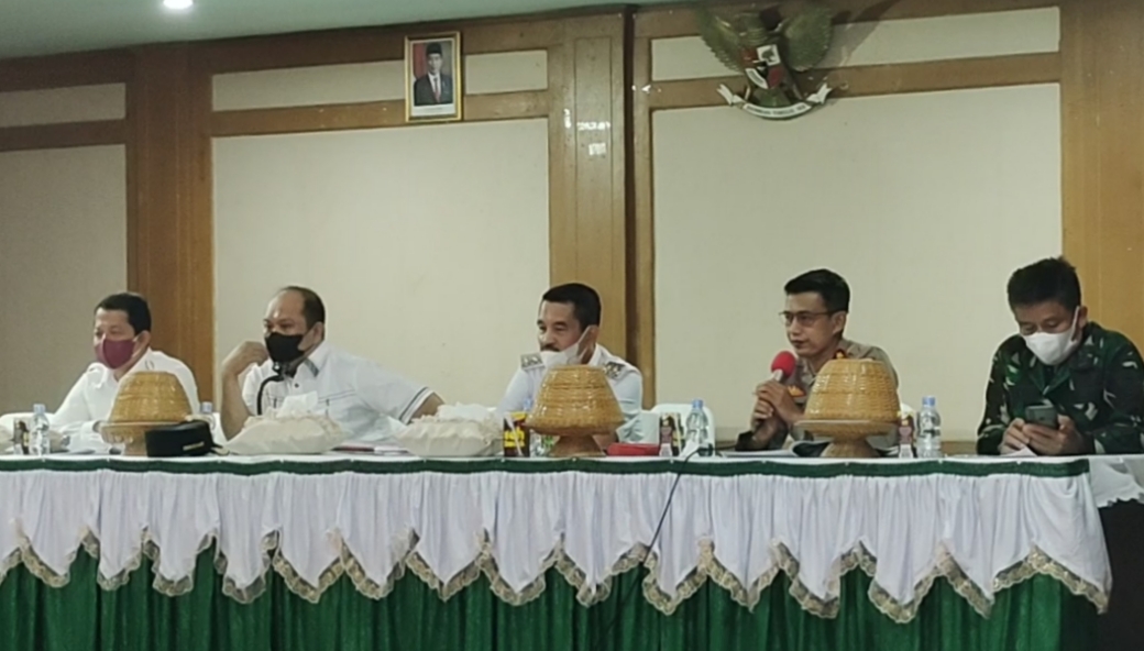 Ketgam: Bupati Konut, Ruksamin bersama Wakil Bupati Konut, Abu Haera saat memimpin rapat terpadu evaluasi pelaksanaan penanganan dan pencegahan covid-19.(Indosultra.Com).