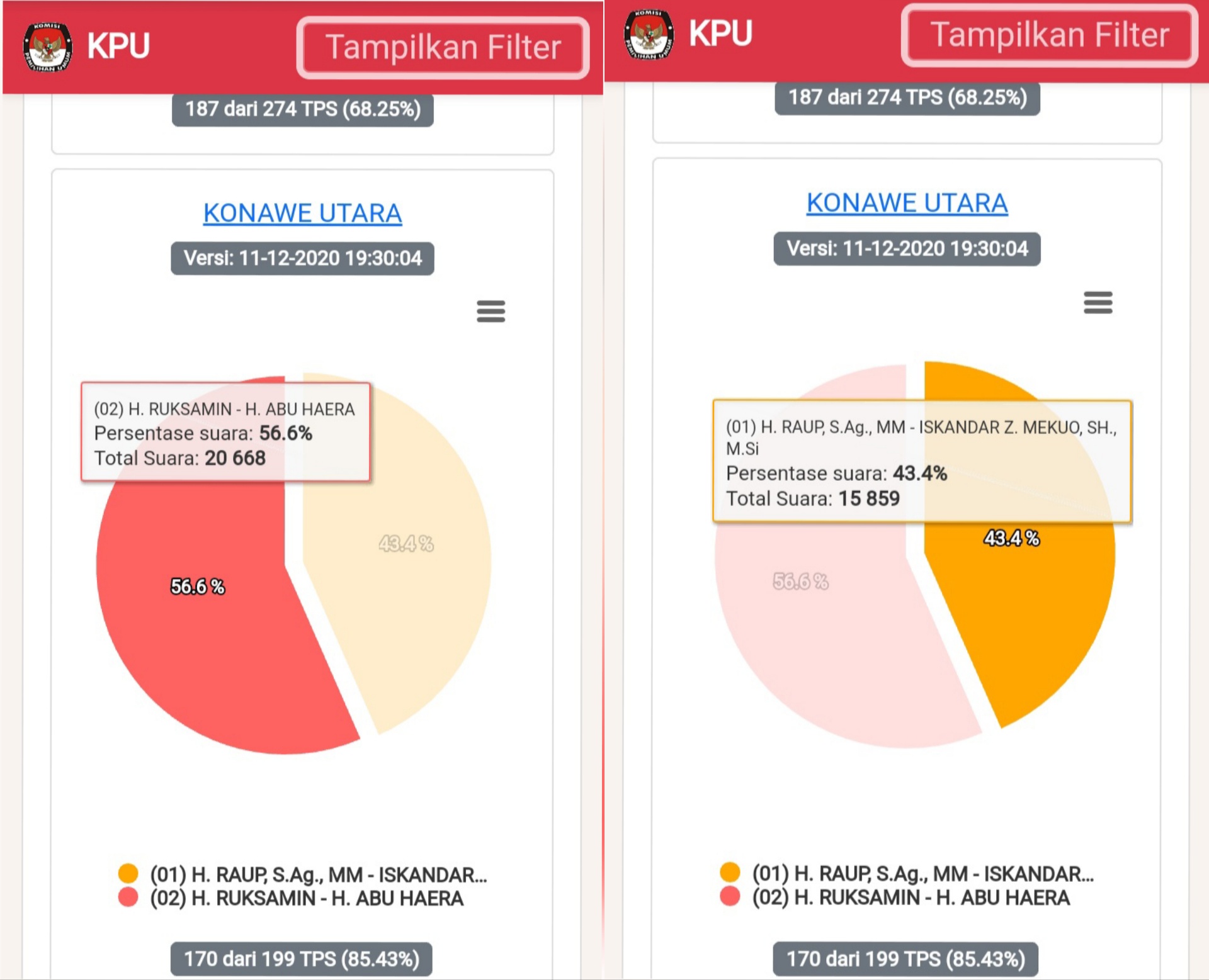 Dikutip dari laman resmi website KPU RI Pilkada Konut 2020, data formulir C1 menunjukkan perolehan suara pasangan nomor urut 2, Ruksamin-Abu Haera tagline Rabu jauh lebih unggul dari paslon nomor urut 1, Raup Iskandar Z Mekuo jargon NKRI.