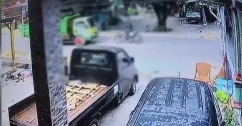 Insiden ini melibatkan antara sepeda motor jenis KLX dengan sebuah mobil truk terekam jelas oleh kamera pengawas (CCTV).