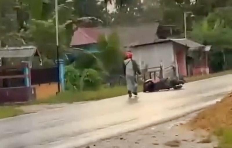Dalam rekaman berdurasi singkat tersebut, tampak dua pengendara melintas di lokasi dan secara tiba-tiba kehilangan kendali, lalu terjatuh hampir bersamaan di titik yang terlihat basah dan mengkilap seperti terkena oli atau solar.