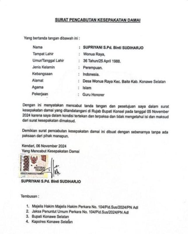 Surat pernyataan Supriyani tersebut ditandatangani di atas meterai 10.000 dan ditembuskan ke Majelis Hakim dan Jaksa Penuntut Umum Perkara Nomor 104/Pid.Sus/2024/PN Andoolo; Bupati Konsel dan Kapolres Konsel.