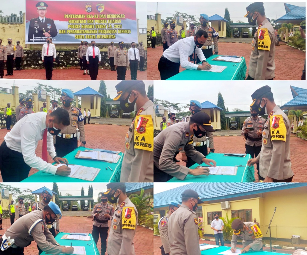 Ketgam: Pejabat Kepolisian Polres Konut saat melangsungkan penandatanganan pakta Integritas di Lapangan Apel Polres Konut Dalam rangka pengelolaan anggaran yang transparan dan akuntabel, Kamis (07/01/2021).(Foto:Istimewah).