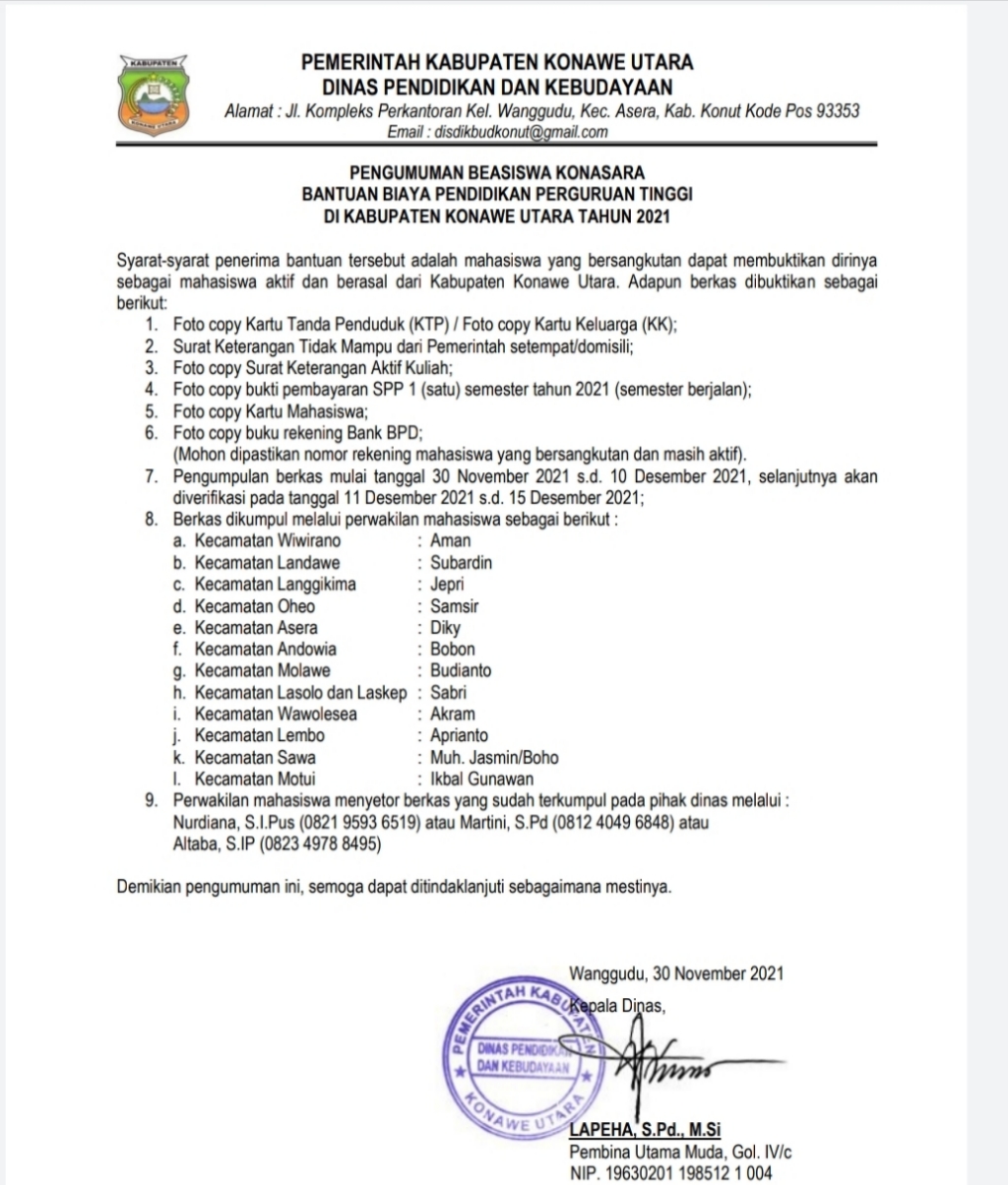 Untuk mempermudah akses pengumpulan berkas para mahasiswa, pihak Disdikbud Konut mempercayakan masing-masing koordinator perwakilan wilayah kecamatan, yang dapat dihubungi langsung antara lain:
