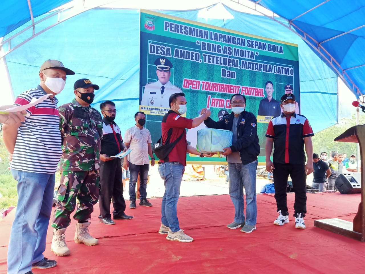 Ketgam: Anggota DPRD Konut, Sudiro bersama Bupati Konut, Ruksamin saat menyerahkan bantuan fasilitas olah raga di acara peresmian lapangan sepak bola Bung As Moita di Desa Tetelupai. (Indosultra.Com).