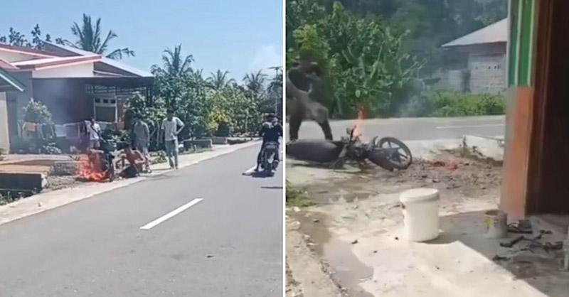 ‎Dalam rekaman video yang diterima redaksi Indosultra.com, tampak motor tersebut dilalap api cukup besar. Pemilik kendaraan pun panik berusaha memadamkan kobaran api dengan peralatan seadanya.