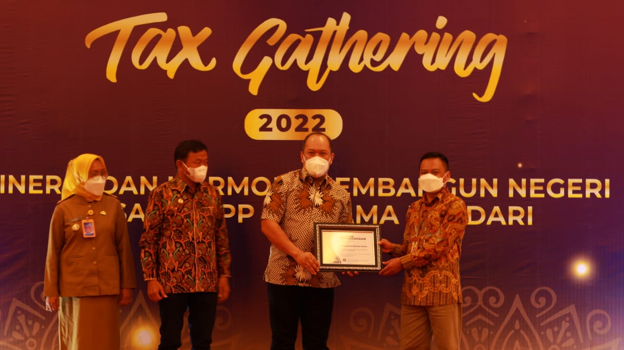 Ketgam: Bupati Konut, Ruksamin saat menerima penghargaan dari KPP Pratama Kendari dan Pemerintah Provinsi Sultra.(Indosultra.Com).