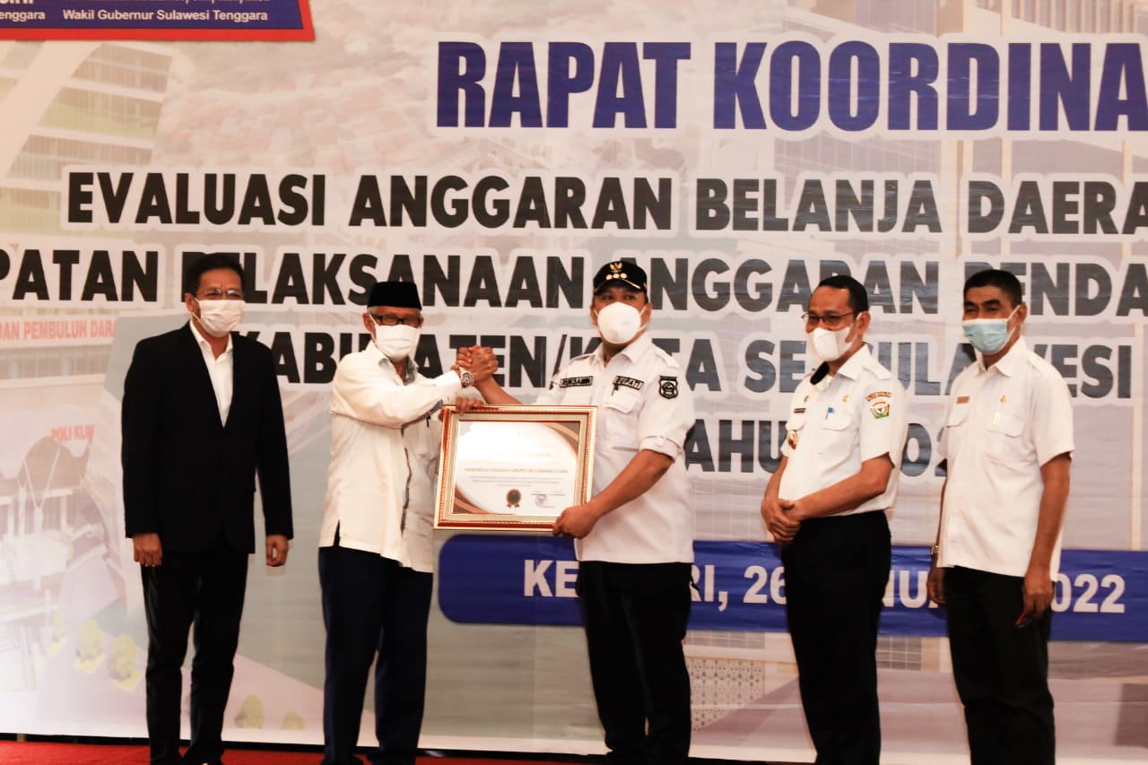 Piagam penghargaan pertama yang diterima Bupati Konut, Ruksamin, sebagai terbaik dalam capaian realisasi anggaran belanja APBD Kabupaten/Kota se-Sultra Tahun 2021 dengan presentase capaian 95,39%.