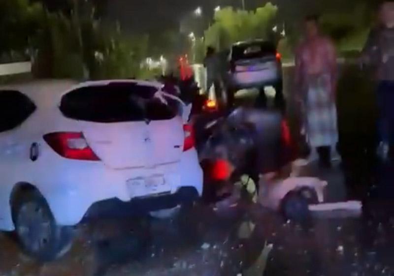 Dari rekaman video yang beredar, salah satu pengemudi terpental keluar dari mobil dan terhempas beberapa meter hingga tergeletak di jalan dengan tubuh berlumuran darah. Meski mengalami luka serius, ia masih dalam kondisi sadar.