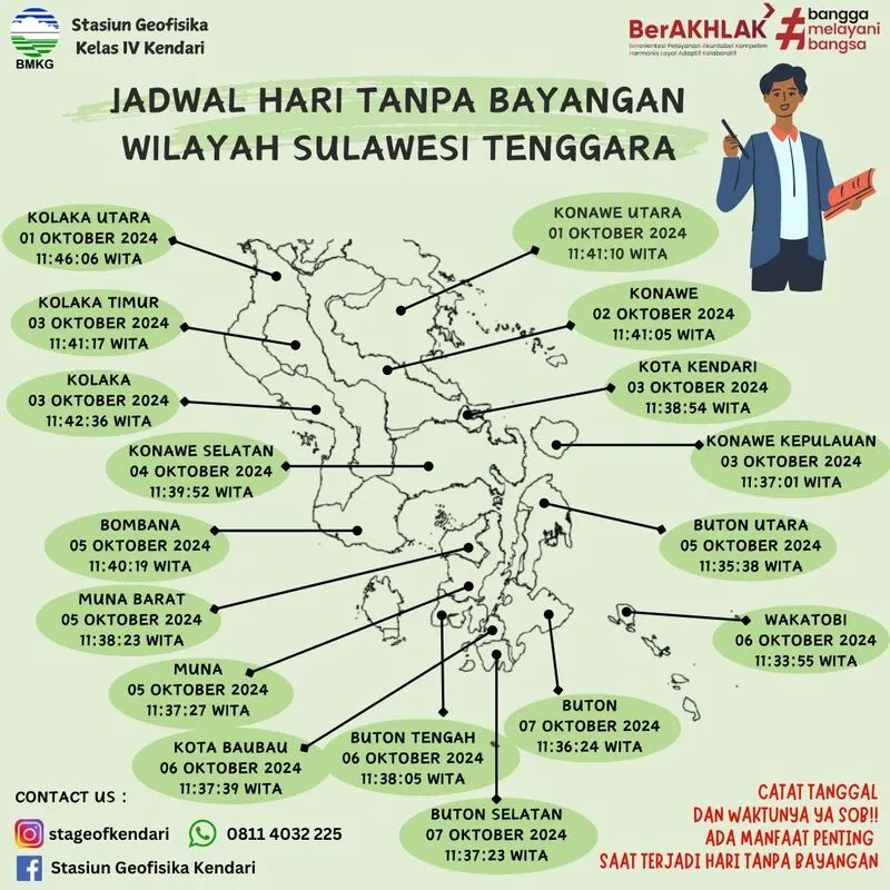 Peristiwa hari tanpa bayangan terjadi pada waktu tertentu di setiap wilayah. Hari tanpa bayangan bakal terjadi di sejumlah wilayah di Tanah Air, tidak terkecuali di Sultra. Berdasarkan data Badan Meteorologi Klimatologi dan Geofisika Stasiun Geofisika Kelas IV Kendari, Kabupaten Kolaka Utara (Kolut) telah dilewati fenomena itu pada 1 Oktober 2024 pukul 11.46 Wita.