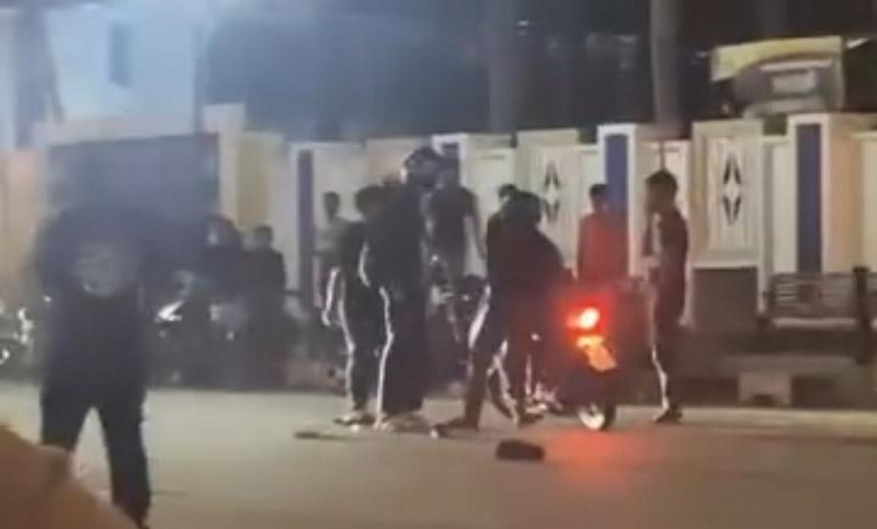 Dalam kondisi panik, salah satu remaja berusaha mengangkat motor yang tergeletak rusak di tepi jalan dan melarikan diri, meninggalkan temannya di tengah kerumunan.