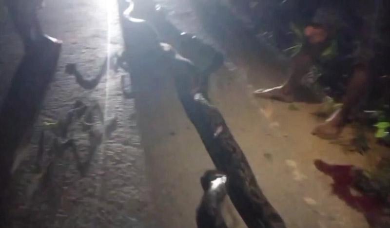 Dari video yang diterima awak media, proses penangkapan berlangsung dramatis. Beruntung ular berhasil dilumpuhkan tanpa ada korban. Terlihat ular berukuran besar itu sudah tidak bergerak.