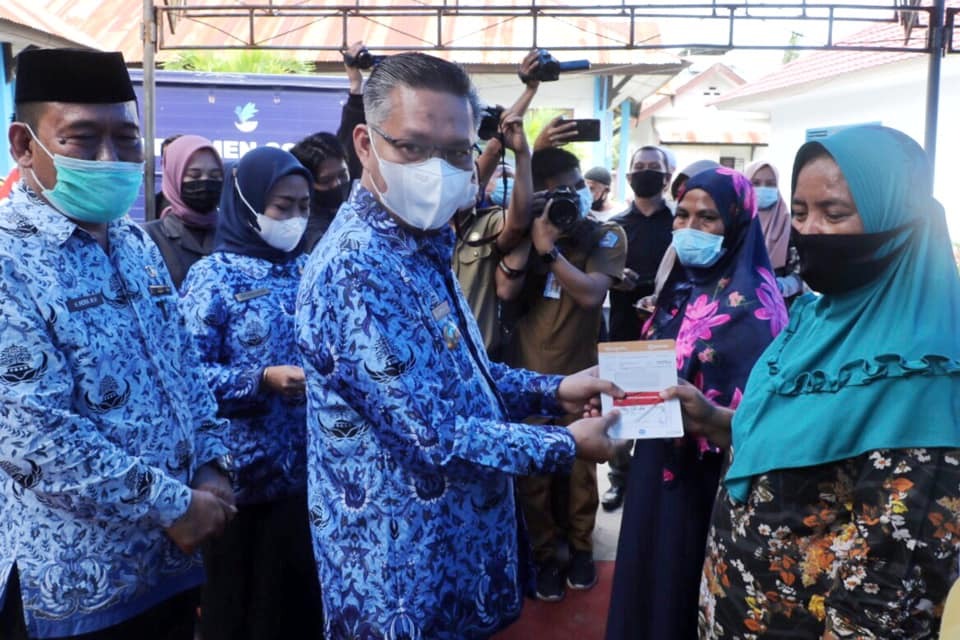 Ketgam: Wali Kota Kendari, Sulkarnain Kadir saat menyalurkan bantuan sosial secara simbolis kepada masyarakat penerima manfaat.(Foto:Indosultra.Com).