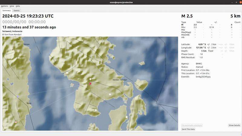 “Info Gempa Mag:2.5, 26-Mar-2024 03:23:23 WITA, Lok:4.09 LS, 121.86 BT(2.9 km BaratDaya Loea, Kab. Kolaka Timur – SULTRA), Kedlmn: 5 km ::BMKG-KDI,” tulis rilis BMKG.