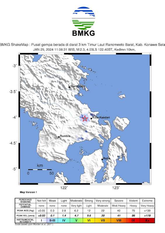 “Dengan memperhatikan lokasi episenter dan kedalaman hiposenter, gempabumi yang terjadi merupakan jenis gempabumi dangkal akibat aktivitas Sesar Kendari, Segmen Utara di Timur Laut Ranomeeto Barat, Kabupaten Konawe Selatan, ” Kata Rudin dalam keterangan resmi via whatsapp, Senin (29/1/2024) siang.