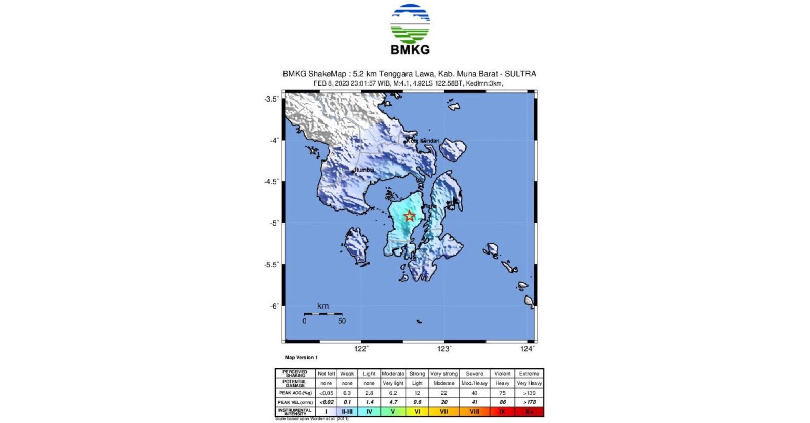 Kepala BMKG Kendari, Rudin mengatakan berdasarkan hasil analisis, menunjukkan informasi gempabumi yang berkekuatan berkekuatan 4.1 SR. Dengan episenter gempabumi terletak pada koordinat 4.92 LS, 122.58 BT, atau tepatnya berlokasi di darat pada jarak 5.2 kilometer, Tenggara Lawa, Kabupaten Muna Barat Provinsi Sultra, pada kedalaman 3 kilometer.