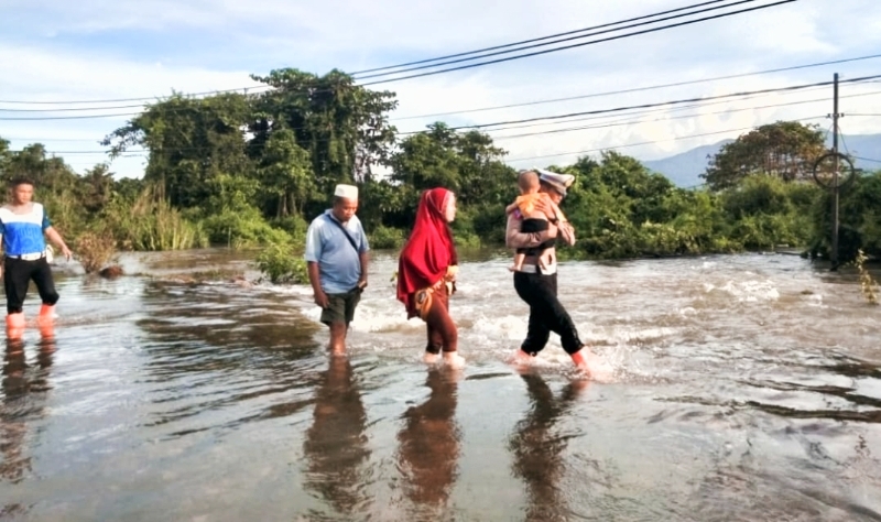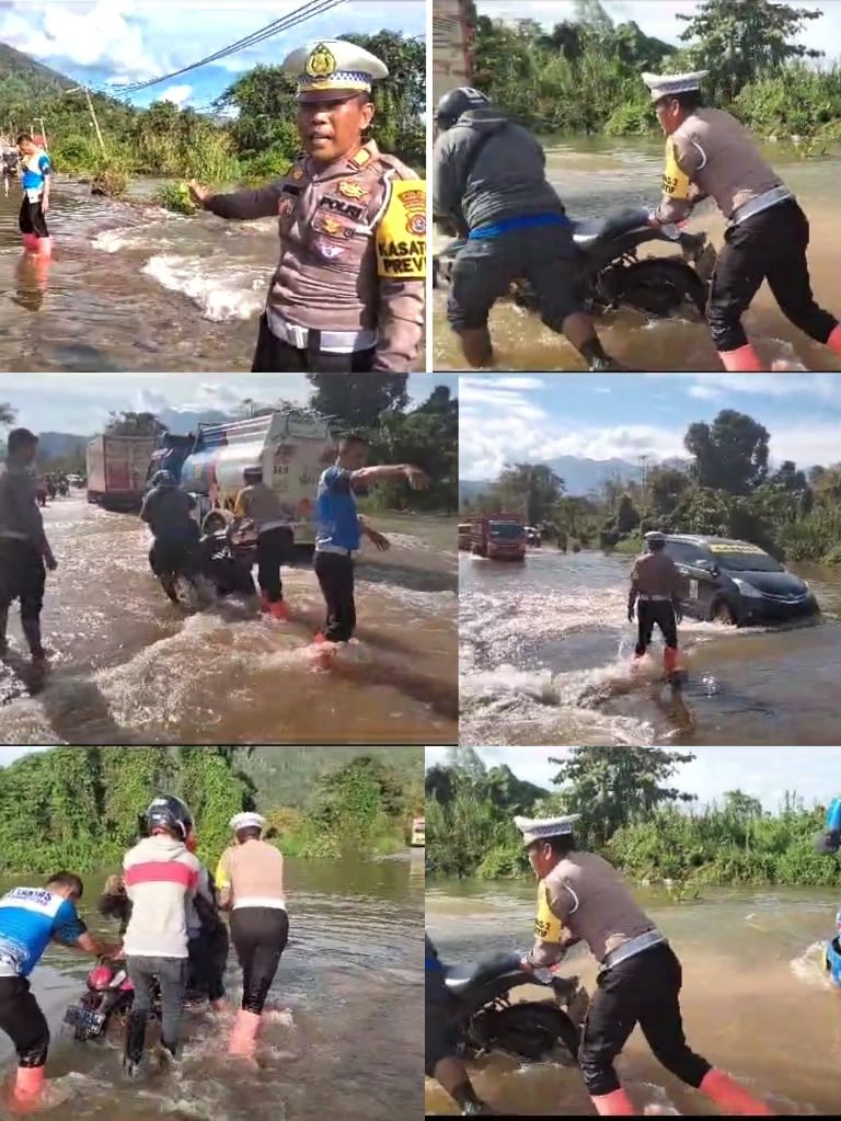 Dilokasi banjir, satlantas Polres Konut melaksanakan pengaturan, himbauan serta membantu masyarakat yang terjebak untuk melintasi jalan yang terendam banjir.