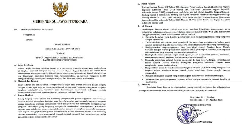 SE yang ditandatangani di Kendari pada 29 Agustus 2025 itu ditujukan kepada seluruh bupati dan wali kota se-Sultra, dengan penekanan agar pemerintah daerah mengambil langkah strategis yang berpihak kepada masyarakat serta menjaga stabilitas daerah.