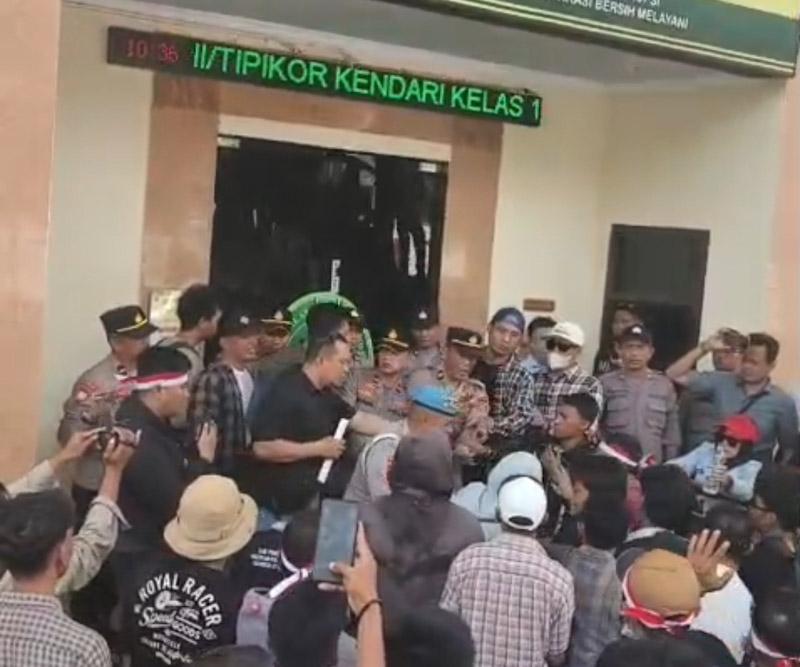 ‎Situasi semakin tak terkendali ketika massa yang tersulut emosi berhasil menerobos hingga ke halaman pengadilan. Kericuhan pecah setelah upaya meminta klarifikasi dari Ketua PN Kendari, Rustam, tidak menghasilkan jawaban yang tegas. Adu dorong pun terjadi, diiringi lemparan botol ke arah pintu masuk saat petugas keamanan mencoba menahan massa.